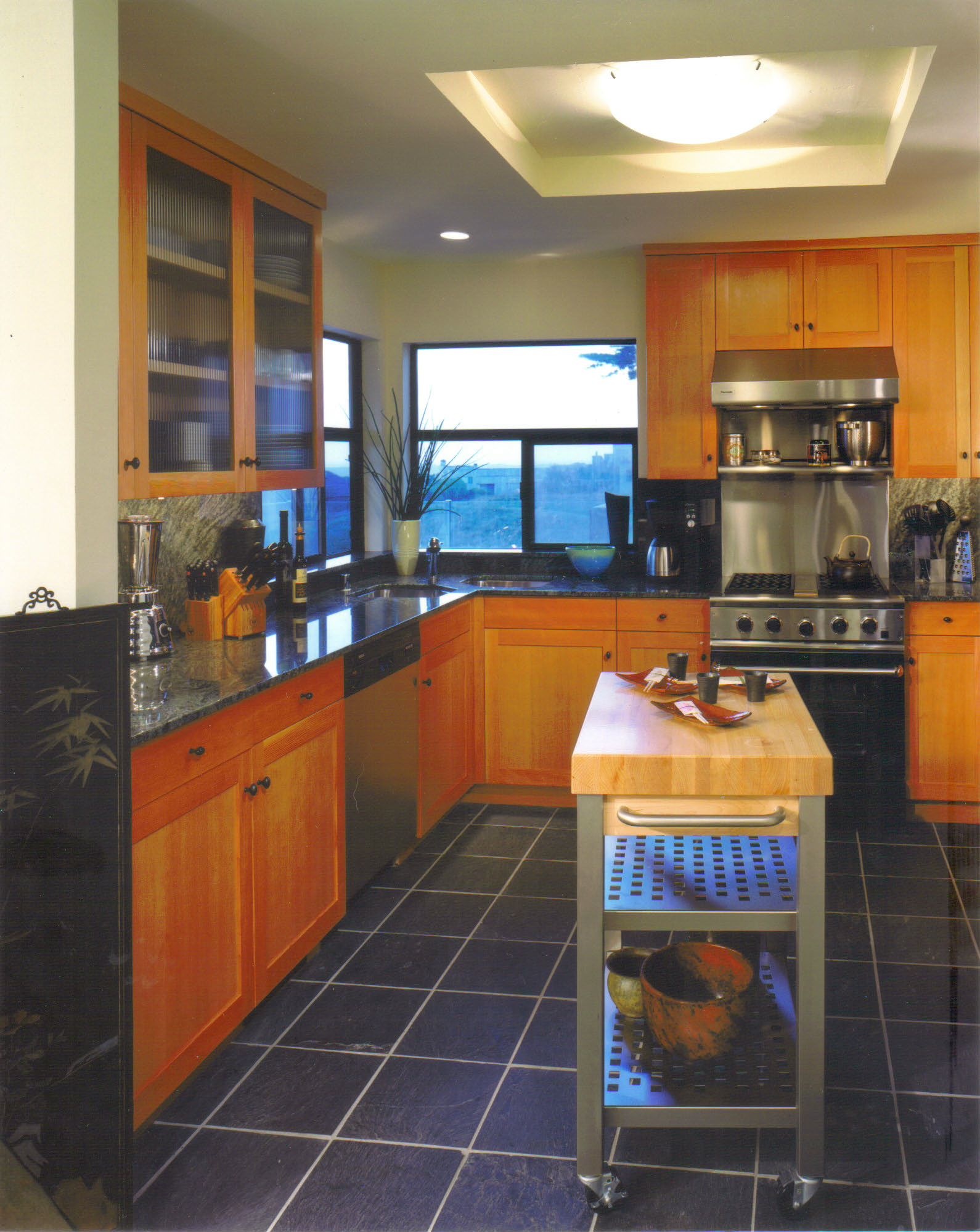 The kitchen, which is open to the dining room, makes the most of the small footprint, while still providing all the necessities. The butcher block island is on wheels for the greatest flexibility. The sink area looks out over the deck and onto the golf course.