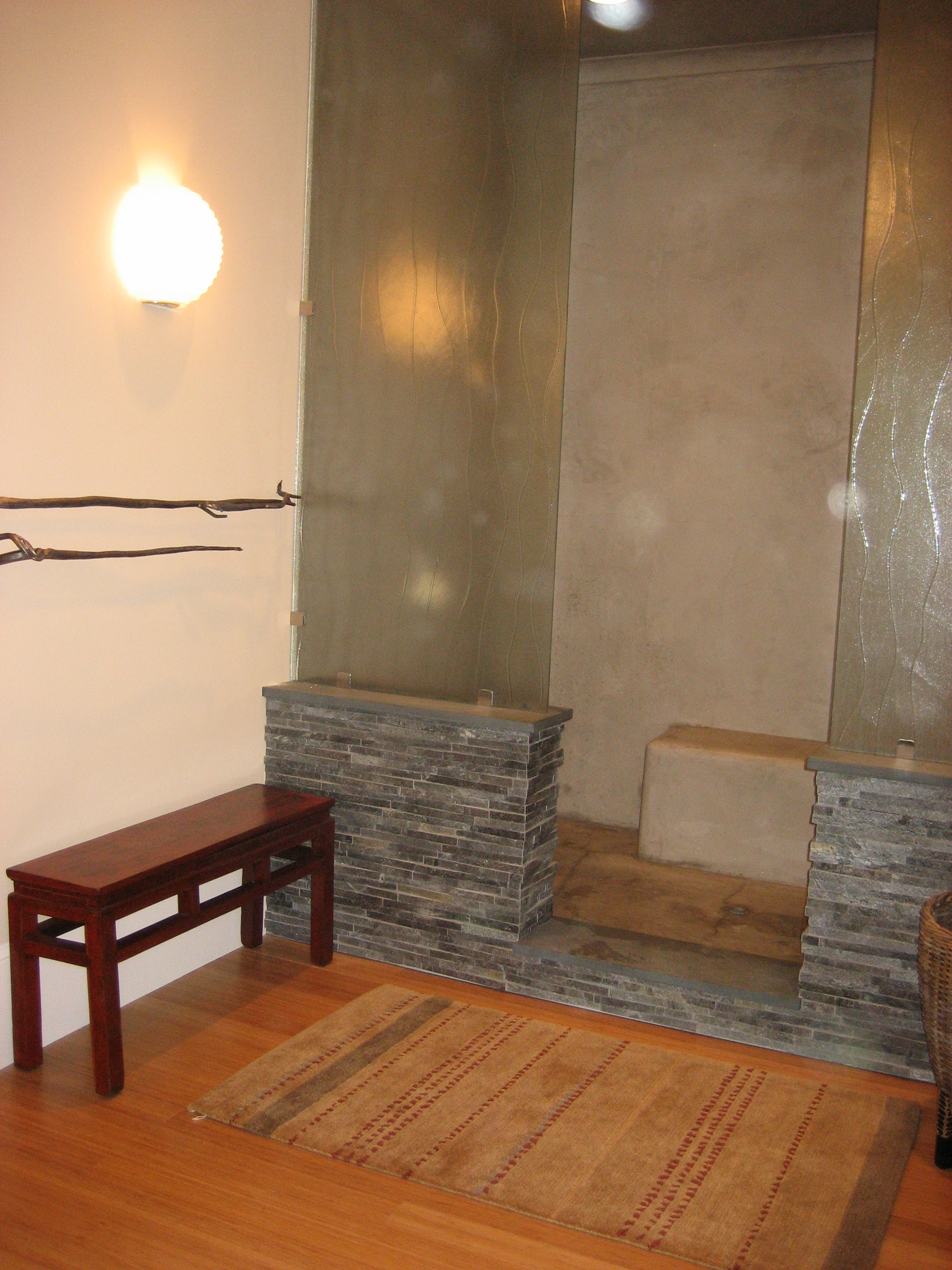 Nobmann Residence – Master Bath #3 Published January 22, 2013 at 1944 × 2592 Walk-in shower with decorative glass and stone surround.